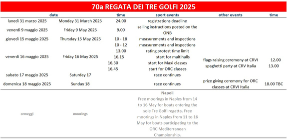The 150 miles course will round the islands of Ponza and Li Galli with arrival in Naples.The 70th edition of the Regata dei Tre Golfi will start from Naples Friday 16th May based on the following program: