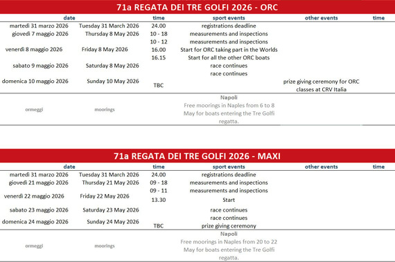 The 150 miles course will round the islands of Ponza and Li Galli with arrival in Naples.The 71st edition of the Regata dei Tre Golfi will start from Naples Friday 8th May for the ORC and on Friday 22nd May for the Maxi based on the following program: