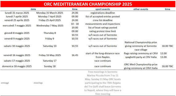 The ORC Mediterranean Championship includes w/l races out of Sorrento from Thursday 8 to Saturday 10 May, valid as National Championship, and the 70th Regata dei Tre Golfi as long-distance race, based on the following program: