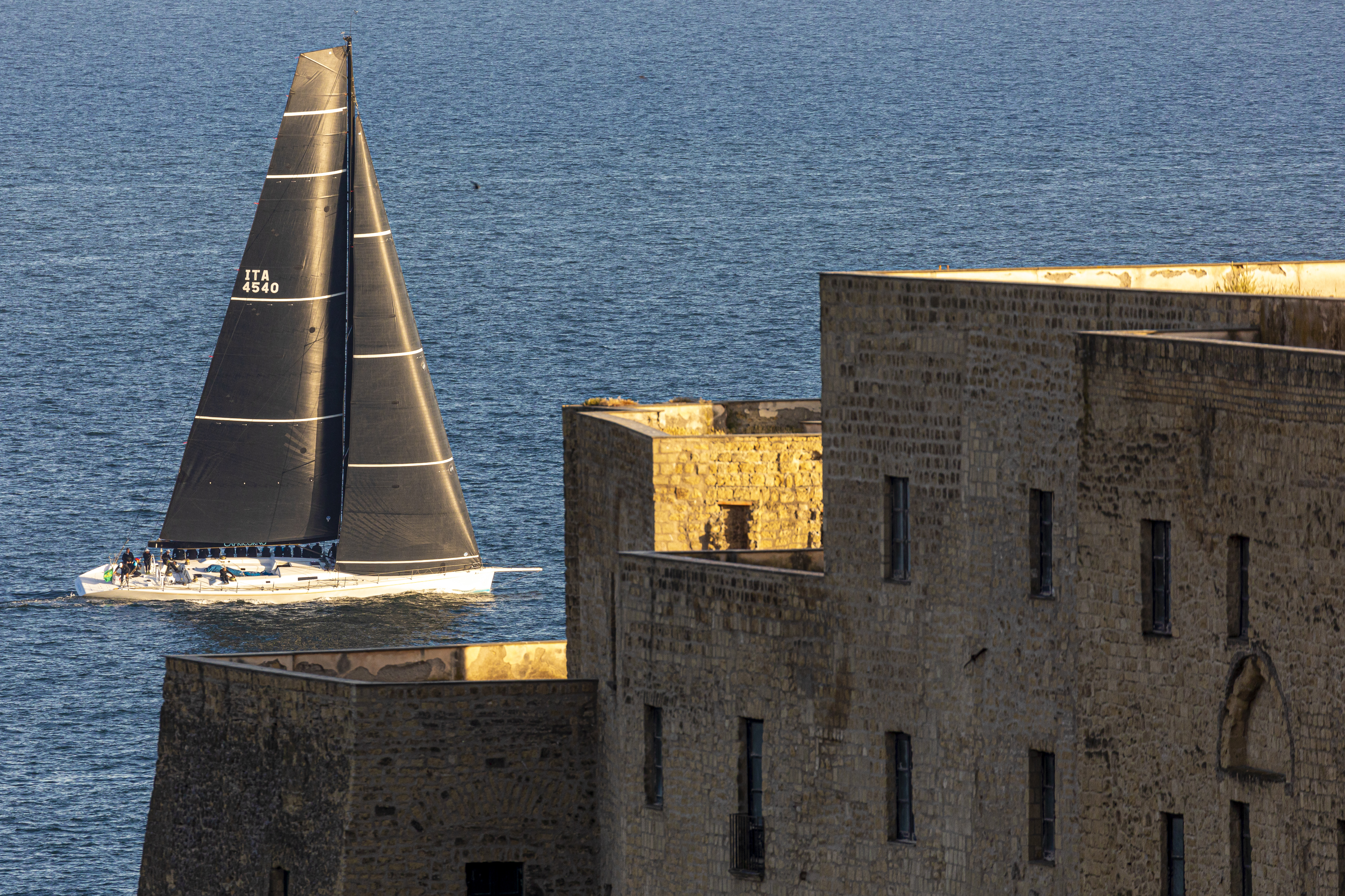 The Regata dei Tre Golfi is typically a light race but this year's was especially so. Fortunately the 155 mile course is an intriguing, complex one, with numerous twists and turns: setting off from Naples' Porticciolo di Santa Lucia, home to the CRVI's clubhouse at 1900 on Saturday, the maxi fleet headed north through the bays of Naples, Salerno and Gaeta to the northerly turning mark of Ponza. They then returned south to the Li Galli rocks, the turning mark off the Amalfi coast, and on, round the south of Capri to the finish off Marina Grande.