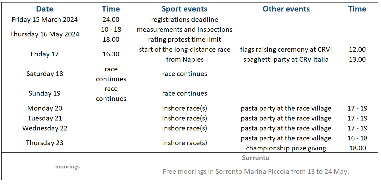 L’edizione 2024 dell'IMA Maxi European Championship è prevista a Sorrento dal 17 al 23 maggio e comprende una prova offshore di circa 150 miglia, sullo stesso percorso della 69esima Regata dei Tre Golfi, seguita da quattro giorni di regate costiere e sulle boe.