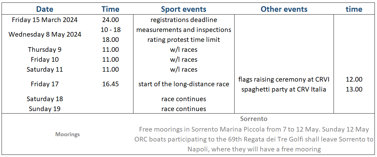 Le regate del Campionato del Mediterraneo ORC, si terranno a Sorrento da giovedi 9 a sabato 11 maggio e prevedono regate a bastone nelle acque fra Capri e Sorrento. La regata aggiudicherà anche il titolo del Campionato Nazionale del Medio e Basso Tirreno, prova di selezione per il Campionato Italiano d’Altura.